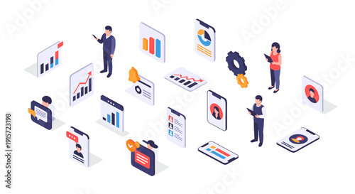 Vysílací a tisková Žurnalistika, izometrická sada ikon, plochá vektorová izolovaná ilustrace. Rozhlasové a televizní vysílání. Tisková média. Tiskárna, polygrafie, tiskárna.