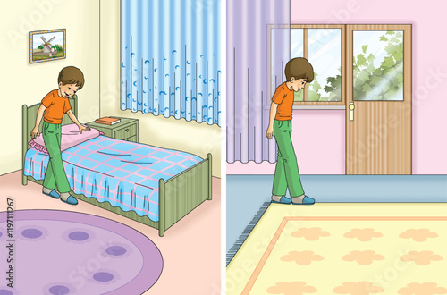 Bratr a sestra čisté dětské ložnice spolu. Koncept čištění domu ilustrace. Vektor web design šablony. Vstupní stránka webové stránky ilustrace.