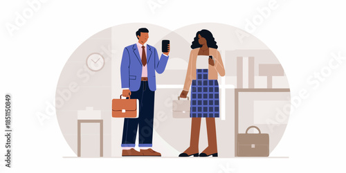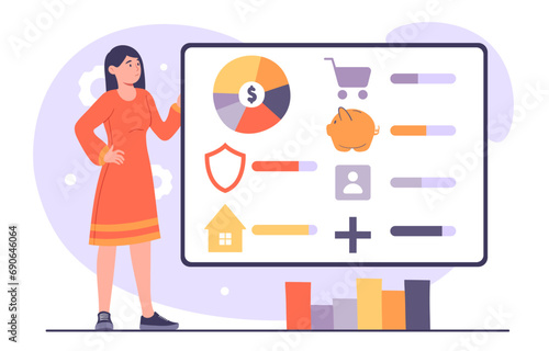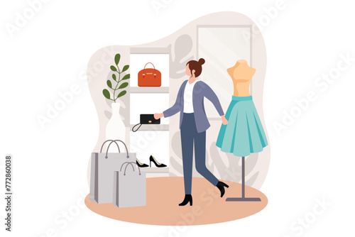 Mladá brunetka se snaží na bílé šaty před zrcadlem v módním butiku, ploché vektorové ilustrace. Obchod s oblečením pro ženy, koncept krásy a módy.