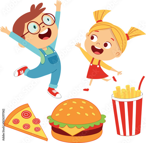 Burger čas, Vektorové ploché ilustrace. Šťastný pár drží obrovský hamburger. Burger objednávka v konceptu restaurace rychlého občerstvení pro webový banner, webovou stránku atd.