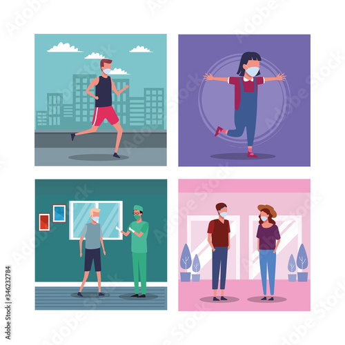 Koncept autobusové zastávky vektorová ilustrace v plochém stylu. Lidé se schovávají před deštivým počasím na autobusové zastávce a čekají na autobus.