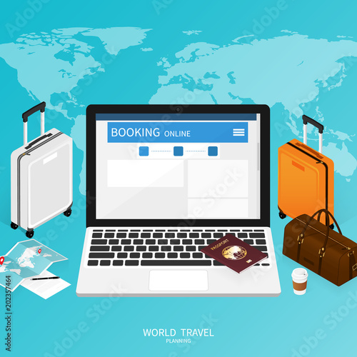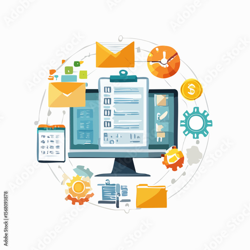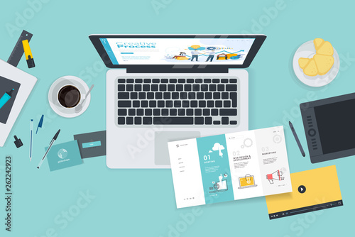 Vektorová ilustrace obchodního a finančního konceptu v designu plochého stylu. Tablet s finančními grafy a grafy. Aktovka, kalkulačka, peníze, list papíru.