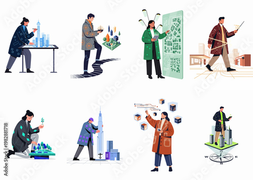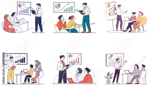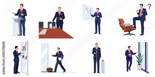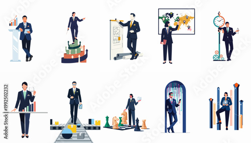 Obchodní bankrot znaková sada, vektorové ploché izolované ilustrace. Zoufalí smutní podnikatelé, kteří mají finanční problémy, nezaplacené dluhy, zřetězené budování podniků. Obchodní zatčení.