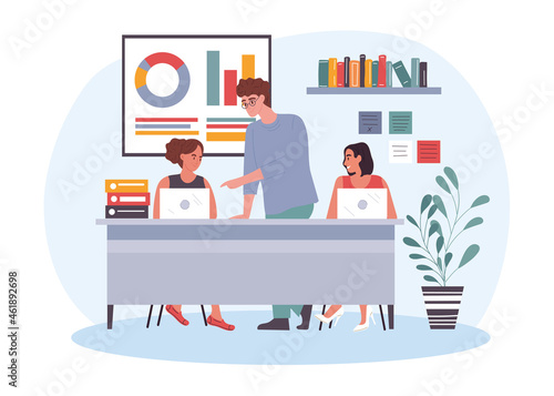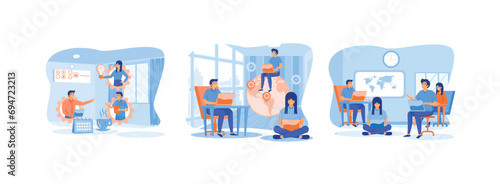 Obchodní tým spolupráce a komunikace scéna set, plochý vektor izolované ilustrace. Týmový videohovor chat, vzdálená týmová práce, partnerství.