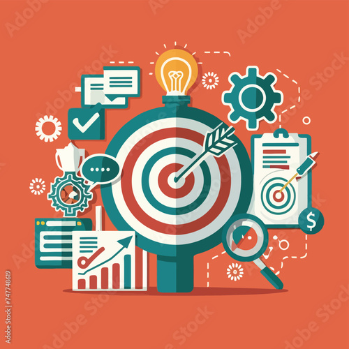 Zahájení podnikatelského projektu, start rakety, ilustrace plochého vektoru. Obchodní tým s cílem, žárovka, peníze, otevřený vývěsní štít. Tým.