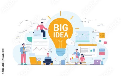 Podnikatelský nápad koncept vektorové ilustrace ve stylu 3D vykreslení. Online marketing, finanční graf, analýza dat, digitální inovace. Obrazovka tabletu s grafy a žárovkou.