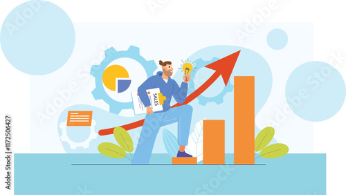 Obchodní vedoucí s dalekohledem vede svůj tým plovoucí na vodě v papírové lodi k finančnímu úspěchu, ploché vektorové ilustrace. Finanční investice do nového nápadu, dosažení cíle, obchodní cesta.