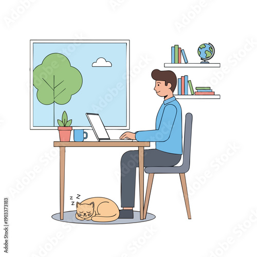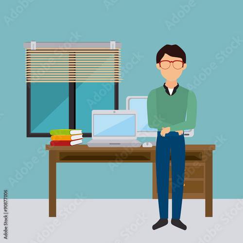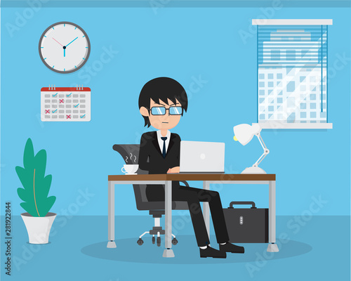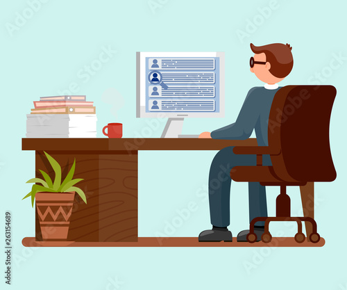 Obchodní muž tvrdě pracuje a sní o dovolené na pláži. Vektorové ilustrace v plochém kresleném stylu. Administrativní pracovník ve stresu sní o tom, že půjde na tropický ostrov.