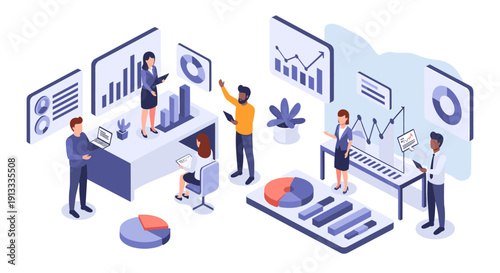 Vektor řízení podniku. Obchodní partneři diskutují o týdenním rozvrhu. Počítač s termínovým kalendářem a plánovačem organizace setkání izometrický design
