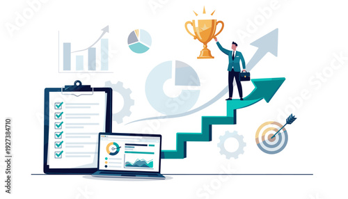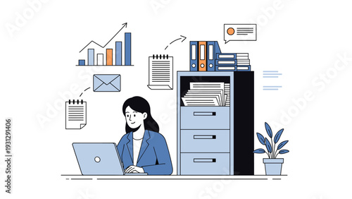 Vektorové ilustrace kancelářských lidí mladé dívky pracující na notebooku, meditující v lotosové pozici, zatímco sedí na sloupcovém grafu. Obchodní metaforický koncept pro webový banner, webovou stránku, prezentaci.