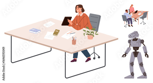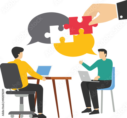Obchodní jednání a partnerství 3D vektorové scény. Podnikatelé hledají řešení, dělat dohodu ilustrace. Podnikatelé a lidská ruka tlačí kousek skládačky