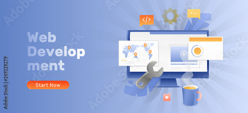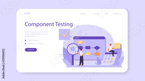 Šablona vstupní stránky kanceláře. Vektorová ilustrace ženy pracující na notebooku, muž hledící dalekohledem, velký počítač, sloupcový graf. Obchodní koncept pro vývoj webových stránek a mobilních stránek.