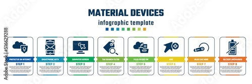 Vybavení a příslušenství pracovního prostoru obchodní kanceláře. Tiskárna, nástěnka, projektor, usb. Obrazovky mobilních aplikací. Vektorový banner šablona pro webové stránky a mobilní vývoj. Ilustrace designu webových stránek.