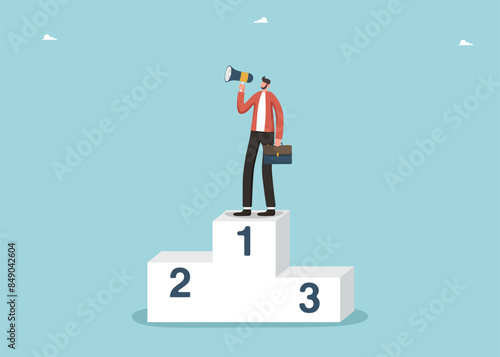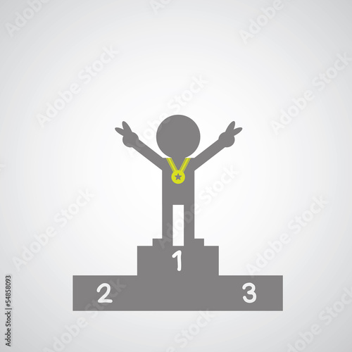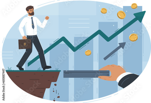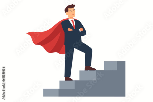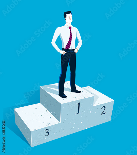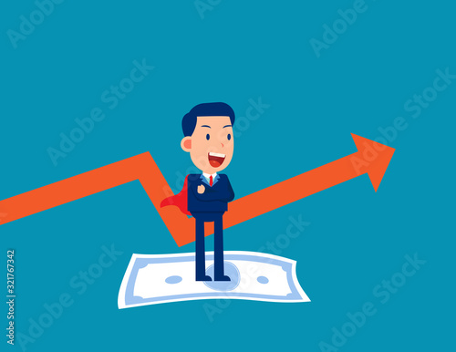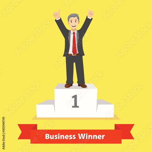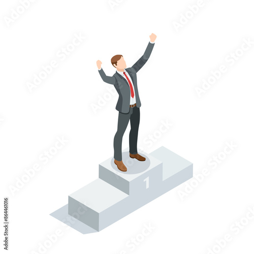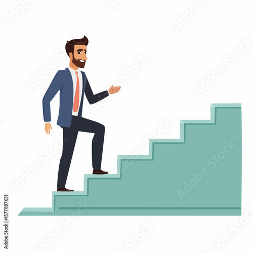 Vektorová ilustrace šťastného podnikatele, který jde nahoru se zvednutou rukou. Podnikatelé plochý designový prvek, ikona izolovaná na bílém pozadí.