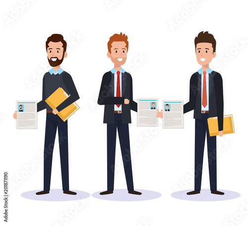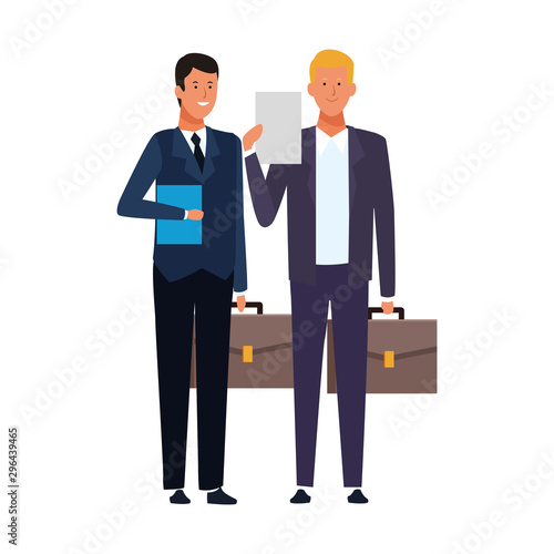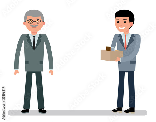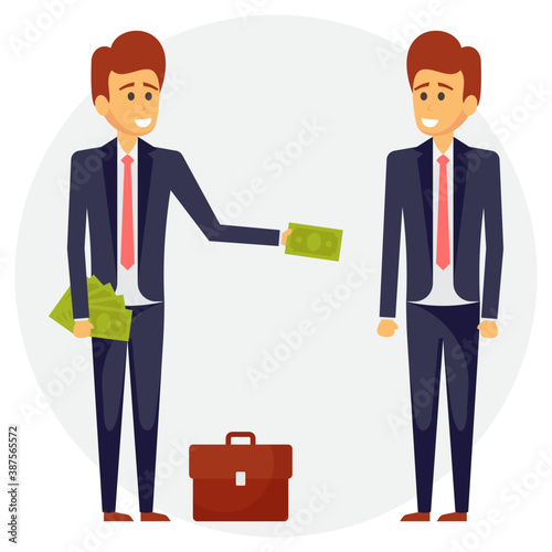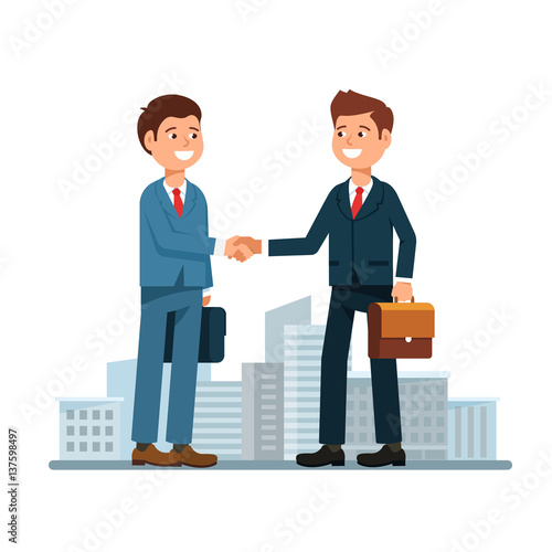 Vektorová ilustrace šťastných podnikatelů, kteří hodně dělají a potřásají si rukama. Podnikatelé handshake plochý styl designové prvky, ikony izolované na bílém pozadí.