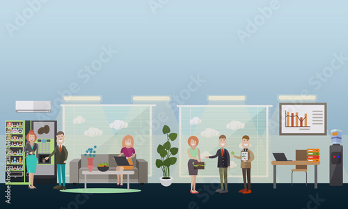 Vektorová ilustrace moderního interiéru pracovního prostoru s kancelářským nábytkem a vybavením, zaměstnanci pracující na notebooku, přestávka na kávu, setkání s partnery, design plochého stylu.