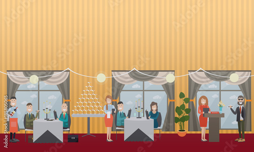 Vektorová ilustrace podnikatelů na večeři v restauraci. Plochý design.