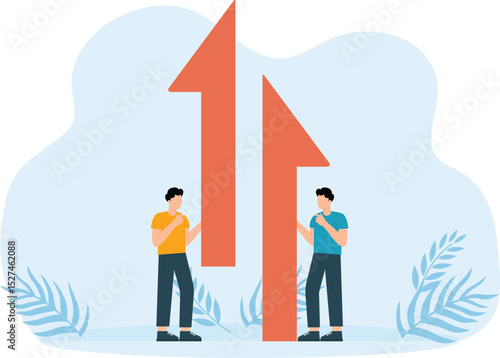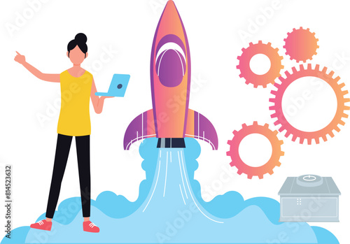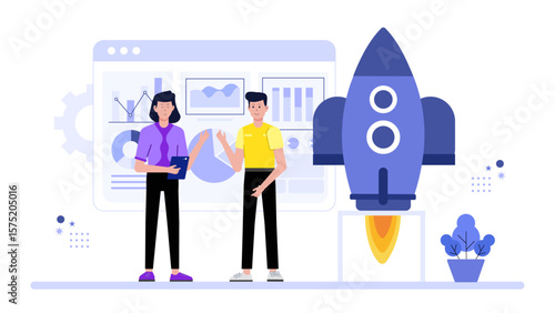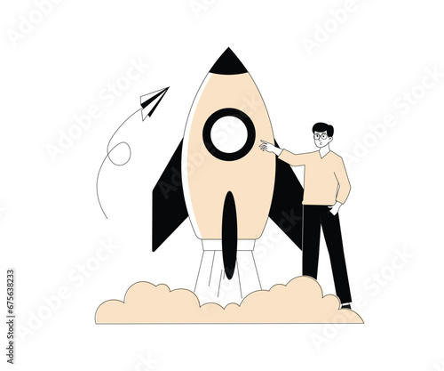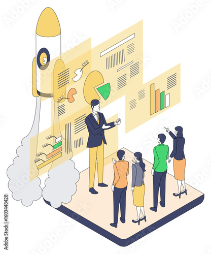 Obchodní lidé při pohledu na létající raketa, ploché vektorové ilustrace. Spuštění vesmírné rakety, nový koncept spuštění obchodního projektu.