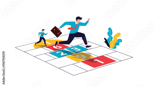 Podnikatelé hrají deskovou hru, ploché vektorové izometrické ilustrace. Cesta k úspěchu, koncept obchodní soutěže.