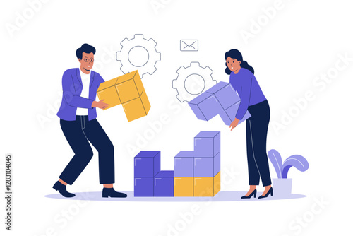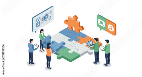 Podnikatelé řešení puzzle, ploché vektorové izometrické ilustrace. Týmová práce, spolupráce, partnerství, obchodní strategie.