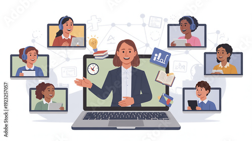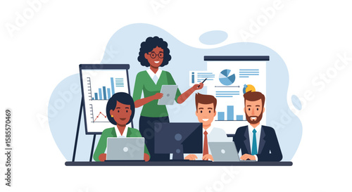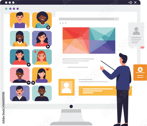 Obrovský smartphone s podnikatelem poskytující online prezentaci, vektorová plochá ilustrace. Webinář na mobilním zařízení, vzdálená prezentace, online obchodní konference, setkání.