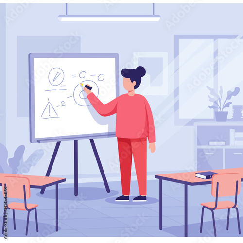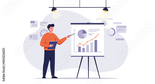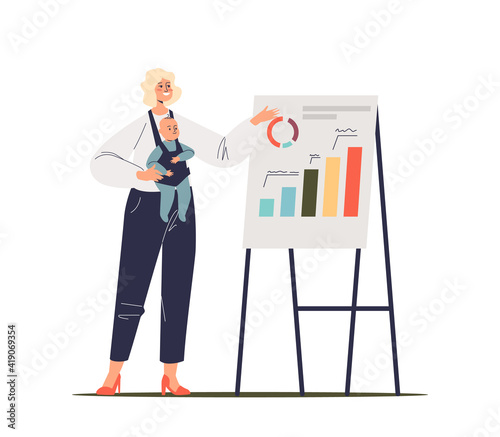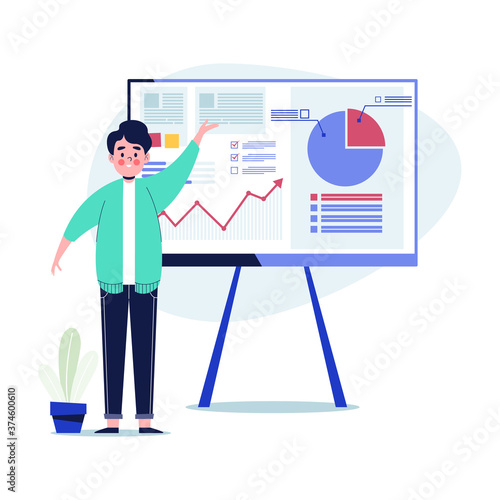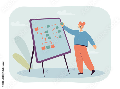 Obchodní prezentace, vektorový plochý design ilustrace. Mladá žena přednáší, ukazuje na grafy na flip chart desce. Obchodní workshop, koncept školení pro webový banner, webovou stránku atd.