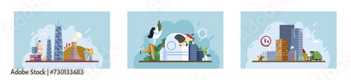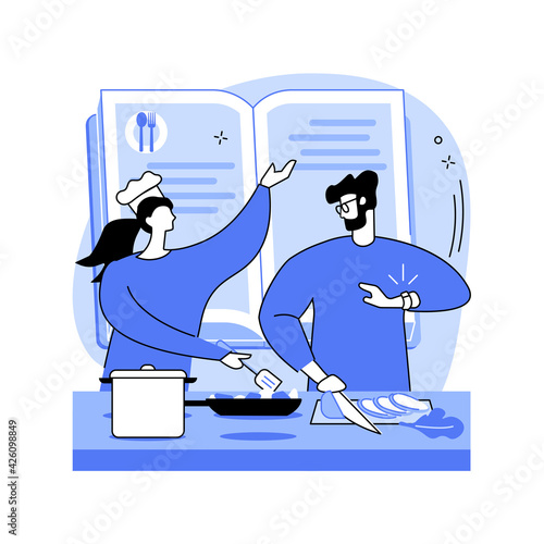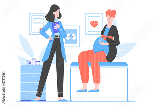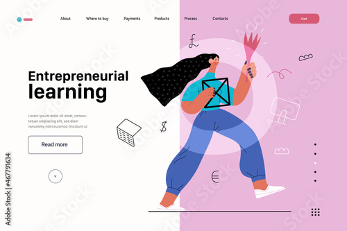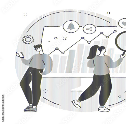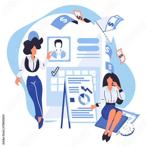 Podnikatelé dávají prezentaci, vektorová plochá ilustrace. Mužské a ženské postavy se znakem dolaru a ukazatelem stojící vedle prezentační tabule. Obchodní přednáška, konference, seminář.