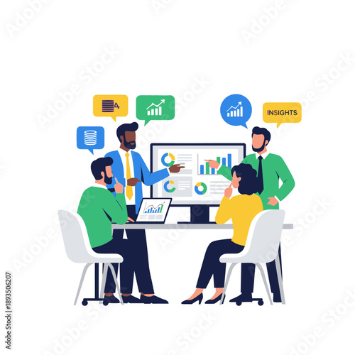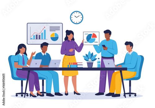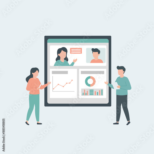 Podnikatel dává prezentaci ukazující na koláčový diagram na flip chart, webinář na mobilním zařízení, vektorová plochá ilustrace. Obchodní seminář, přednáška, videokonference, online setkání obchodního týmu.