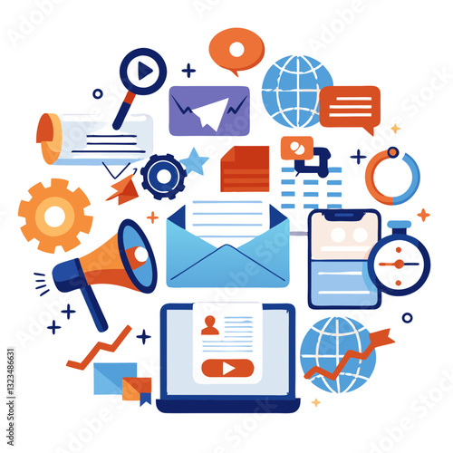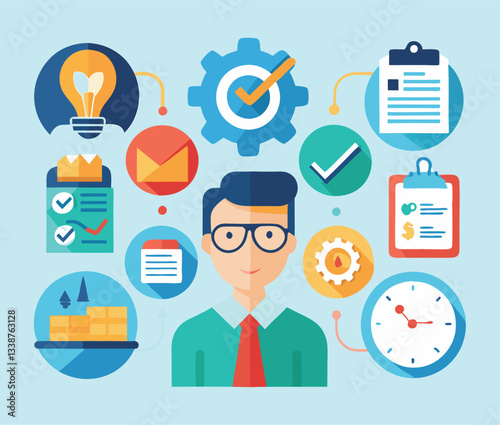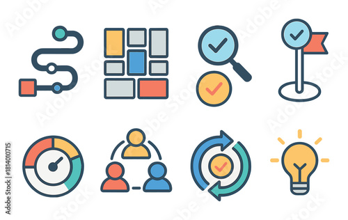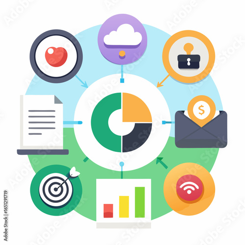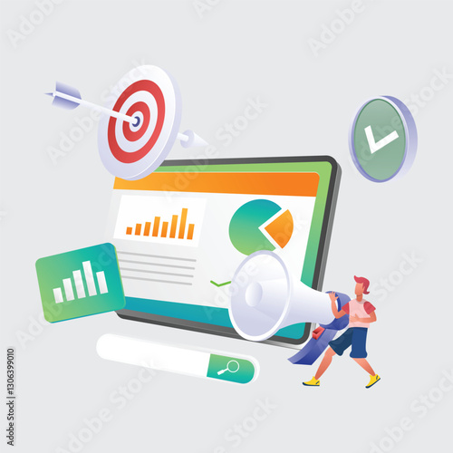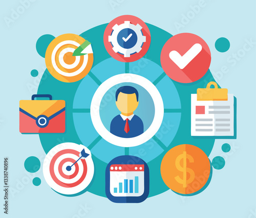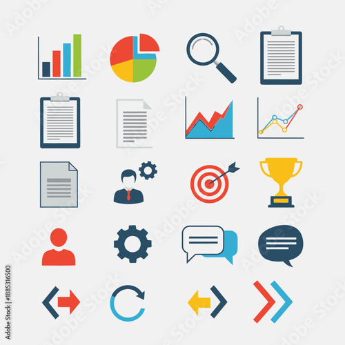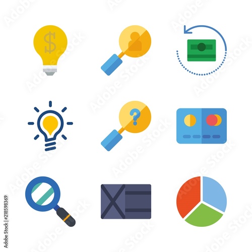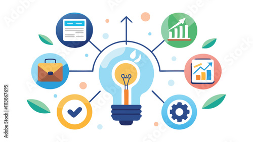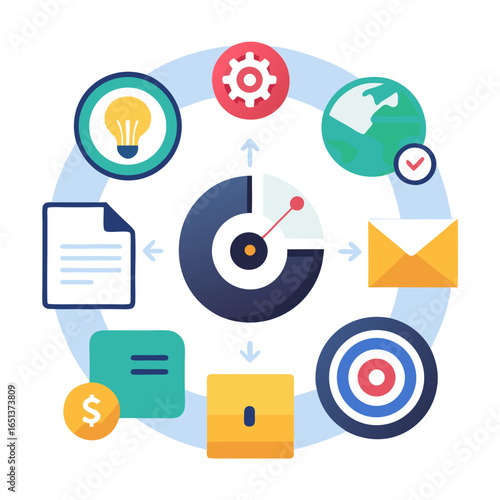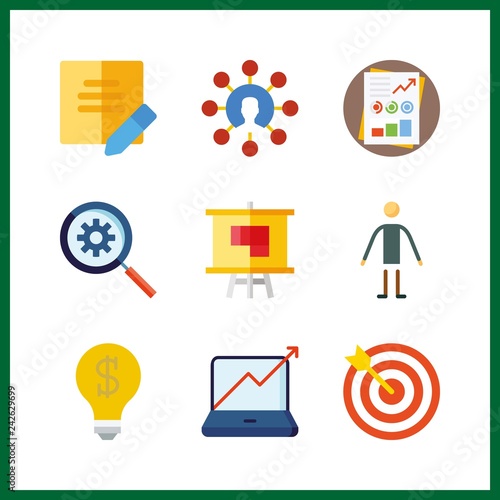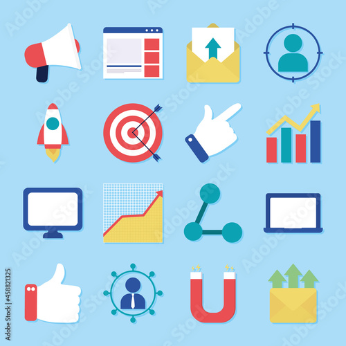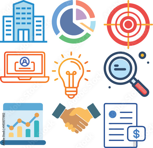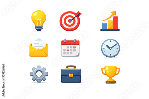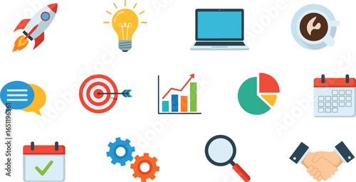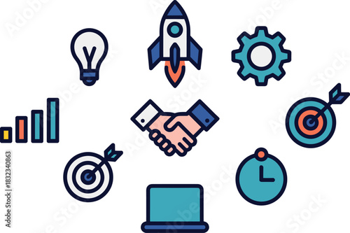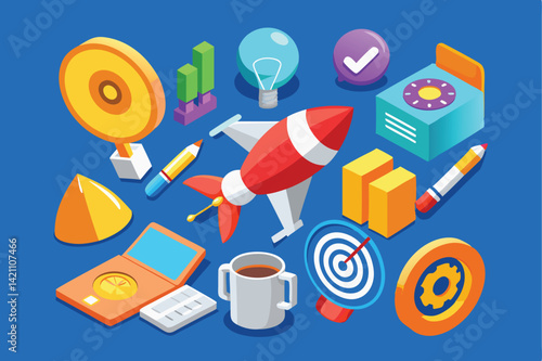 Podnikatelský projekt startup vector 3D ikona design ilustrace. Rocket shop, idea žárovka, graf graf bar, šipka, zpráva chat bublina, loupe, kreditní karty, peníze symbol, cíl cíl terč