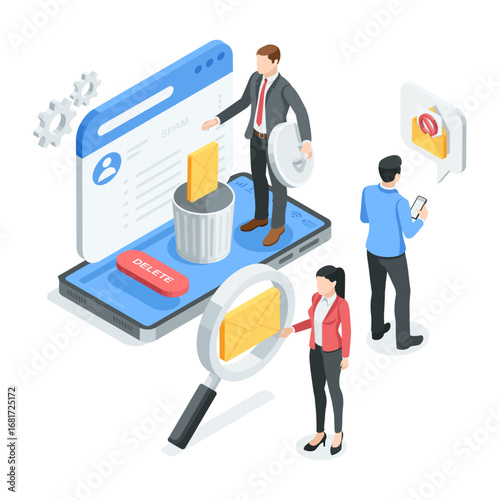 Kampaň na podporu podnikání, plochá vektorová izometrická ilustrace. Digitální mobilní marketing, sociální média, obsahový marketing, přitažlivost zákazníků, seo.