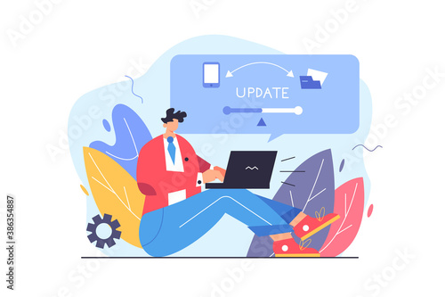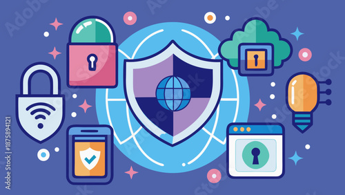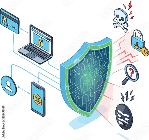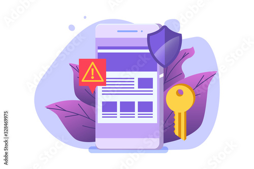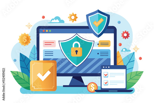Vektorová ilustrace koncepce ochrany podnikání. Štít chrání data a podnikání před riziky. Plakát v plochém stylu.