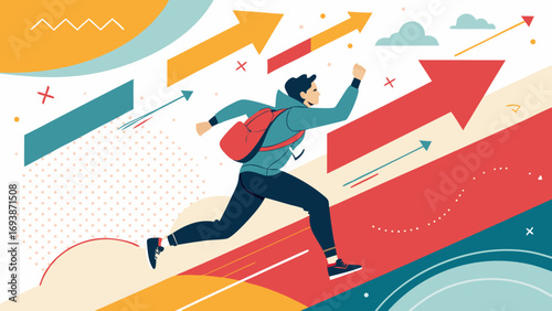 Vektorová ilustrace podnikatele překonávání výzev, jako je steeplechaser. Graf představující růst podnikání.