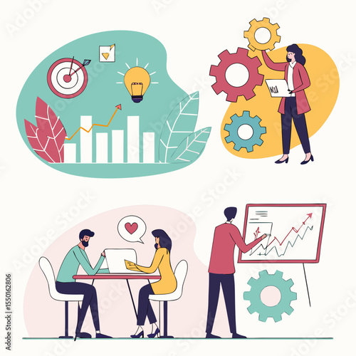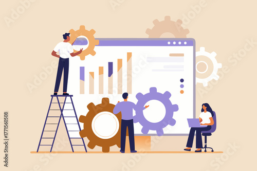 Vektorová ilustrace velkého strategického řídicího panelu a drobných zaměstnanců lidí, kteří interagují s grafy, drží lupu. Koncept obchodní strategie pro webový banner, webovou stránku atd.