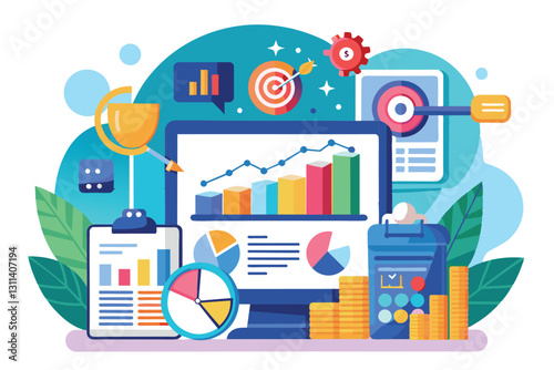 Obchodní strategie vektorový plochý styl designu ilustrace. Počítač s rostoucím grafem, aktovkou, lupou, šipkami, sirénou, ručním držením skládaček. Obchodní koncept pro web banner webové stránky Stránky atd.