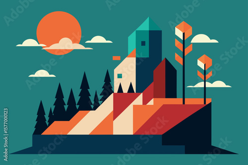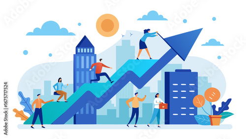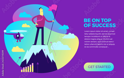 Podnikatel lezení štafle dosáhnout trofej pohár na vrcholu hory, vektorový plochý styl designu ilustrace. Úspěch obchodního týmu, vedení, dosažení cíle, obchodní kariéra.