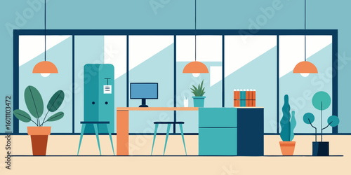 Vektorová ilustrace profesionálního tvůrčího týmu pracujícího na podnikatelském projektu. Interiér kancelářské místnosti s kancelářskými potřebami a vybavením. Plochý design.