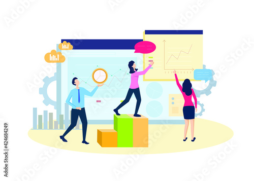 Obchodní tým dělat žárovka koláčový graf dohromady, ploché vektorové izometrické ilustrace. Týmová práce, spolupráce, partnerství, spolupráce.