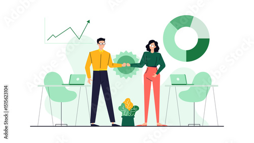Obchodní tým mužské a ženské kreslené postavičky lezení nahoru stoupající sloupcový graf k dosažení cíle, ploché vektorové ilustrace. Týmová práce, obchodní úspěch.