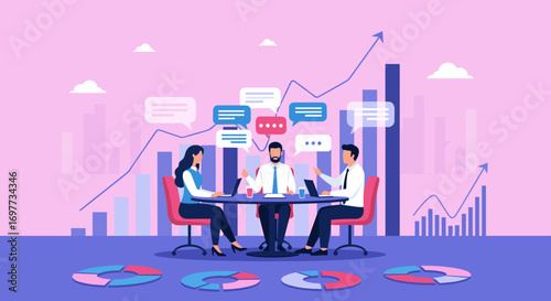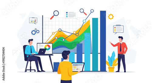 Vektorová ilustrace velkého rostoucího sloupcového grafu a rostoucí šipky, kterou se drobní podnikatelé snaží společně zvednout. Obchodní tým, coworking, plánovací koncept pro webový banner, webovou stránku atd.