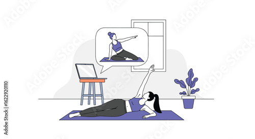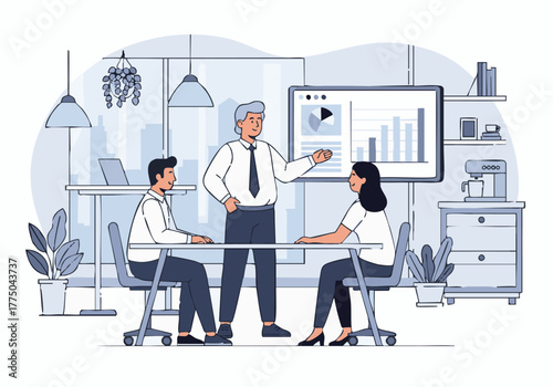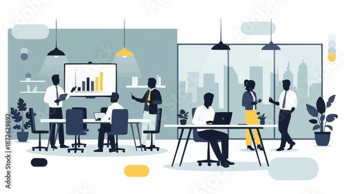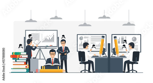 Vektorová ilustrace sloupcového grafu a kancelářských lidí mladá dívka medituje v lotosové pozici a muž drží složku. Obchodní koncept pro webový banner, webové stránky, prezentace.