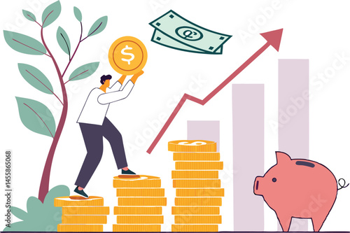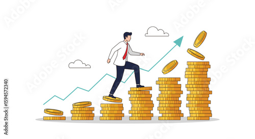 Obchodní žena lezení zlatý ingot schodiště s vlajkou na vrcholu, ploché vektorové ilustrace. Finanční úspěch, investice.