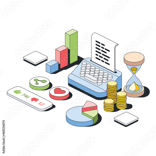 Obchodní žena šplhá po schodišti dolarových mincí s vlajkou nahoře, plochá vektorová izometrická ilustrace. Finanční úspěch, kariérní žebříček.