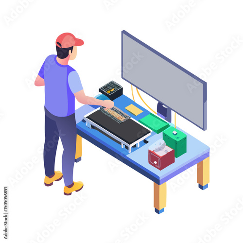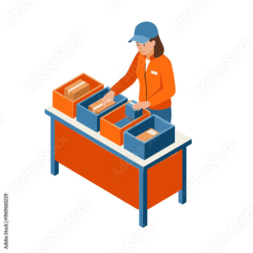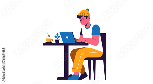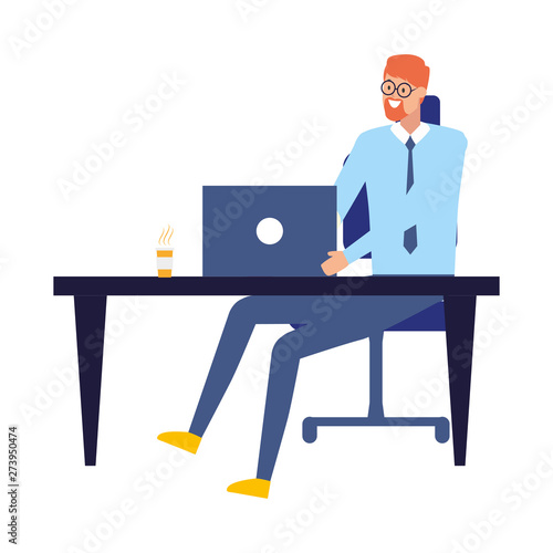 Podnikatelka pracovat na dálku na ikonu počítače vektoru. Nezávislý pracovník sedí u stolu stůl izolovaných na bílém pozadí