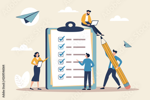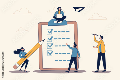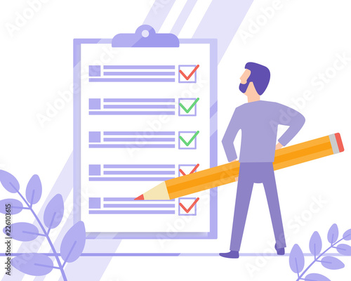 Podnikatel přidání zaškrtnutí v seznamu úkolů s úkoly na schránky, ploché vektorové ilustrace. Správa úloh, plánování, plánování.