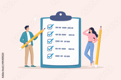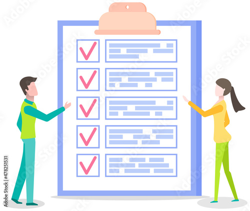 Podnikatel přidání zaškrtnutí v seznamu úkolů s úkoly na schránky, ploché vektorové ilustrace. Správa úloh, plánování, plánování.