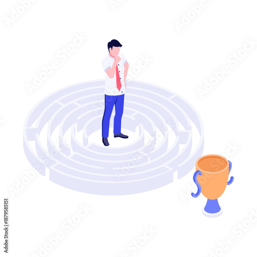 Podnikatel a tvrdá cesta k úspěchu izometrické vektorové ilustrace. Vedoucí Kanceláře stojící před bludištěm myšlení strategie se snaží vybrat správnou cestu. Dosažení cíle a koncept labyrintu