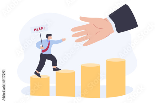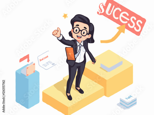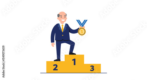 Sebevědomý podnikatel šplhající po kariérním žebříčku s trofejním oceněním a vlajkou nahoře, ploché vektorové ilustrace. Profesní kariérní růst, obchodní úspěch,vedení.