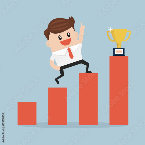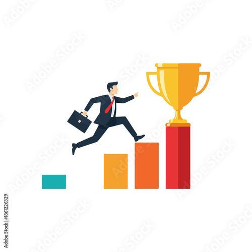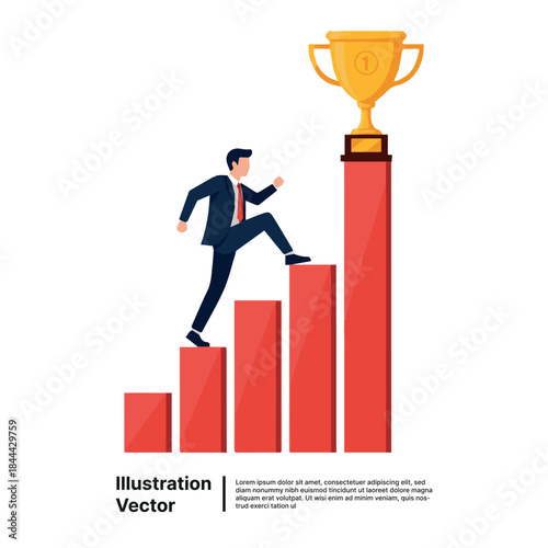 Podnikatel šplhá po žebříku k úspěchu. Dosažení cíle. Motivace a cíl koncepce být úspěšný v podnikání a životě. Vektorová ilustrace v plochém provedení.
