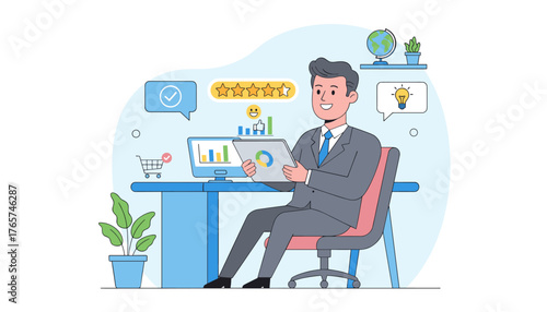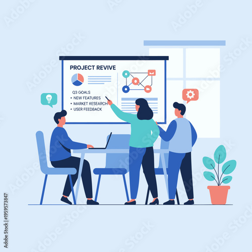 Vektorová ilustrace podnikatele běžícího s kufříkem. Moderní kancelářský interiér, tabule pro prezentaci, chladič vody. Plochý design.