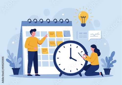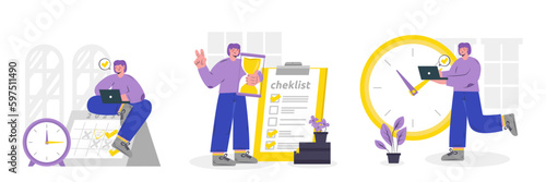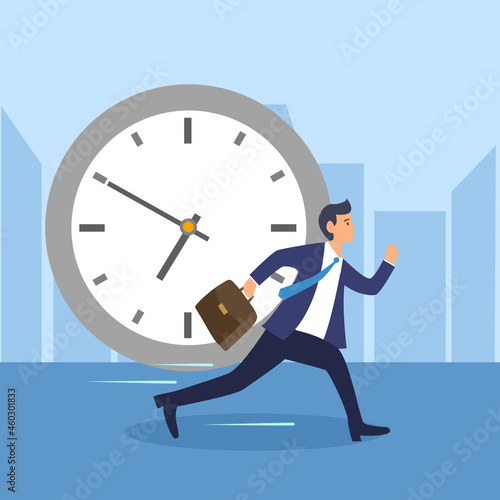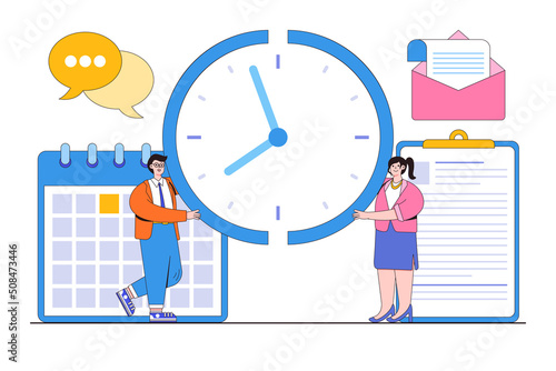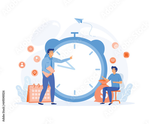 Podnikatel, zaměstnanec s notebookem stojící vedle obrovské hodiny, ploché vektorové ilustrace. Online správa úkolů, plánovací plán, sebeovládání.